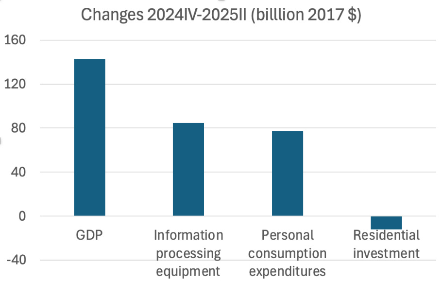 The chart below shows the changes between the fourth quarter of 2024 and the second quarter of 2025 in real GDP and some of its components. Investment in information processing equipment — which at this point basically means data centers — accounted for more than half of overall growth, more than consumer spending, which makes up 70 percent of the economy: